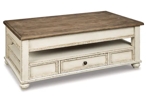 The Realyn lift top coffee table is traditional cottage styling taken to a new level. Antiqued two-tone finish blends a chipped white with a distressed wood finished top for a double serving of charm. Crafted with quality dovetail construction, this coffee table with drawer and open shelf space melds function with exceptional form.