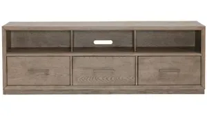 Make your home impressive with the City Scape Entertainment TV Console. Crafted with excellence using rubberwood solids and split heart white oak veneers, this piece features a Wire-Brushed Burnished Beige finish. Three full extension drawers stretch across the bottom of the TV console, each with an open storage cubby directly above for plenty of storage. The drawers are accented with a Brushed Brass bar pull hardware. The plinth base gives a contemporary feel. Convey energy and imagination with this entertainment TV console.