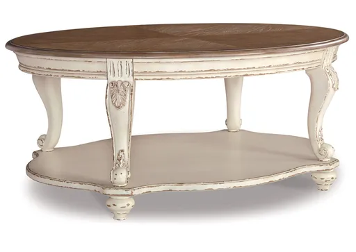 Elevating the art of traditional cottage styling, the Realyn oval coffee table is sure to serve you beautifully for years to come. Antiqued two-tone aesthetic blends a chipped white with a distressed wood finished top for added charm. Classic cabriole legs and shapely lower shelf are a lovely twist. Decorative corbels add refinement.