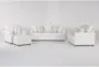 The Amora Ivory White Fabric 4 Piece Set brings classic elegance to your living room with its traditional coastal style. This complete seating collection includes a sofa, loveseat, armchair, and ottoman with roll arm frames and welted seams creating a timeless silhouette in an ivory white shade that complements any living space.