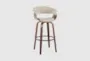 Enhance your dining room or kitchen with the Vintage Modern 30" Barstool. This stylish barstool features a swivel design and is upholstered in cream fabric, providing both comfort and a touch of mid-century modern flair. The walnut bentwood frame and round black metal footrest add durability and a sophisticated look to your space.