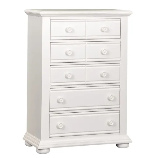 Obtain a fashionable cottage look with the Summer House 5 drawer chest. Crafted of pine solids with painted MDF, this piece features the best of cottage in an oyster white finish, bottom case dust proofing, fully stained interior drawers, full extension drawer glides for easy access to storage, bluff cut top drawers, bun feet, felt lined top drawers, and is accented by wood knob hardware.