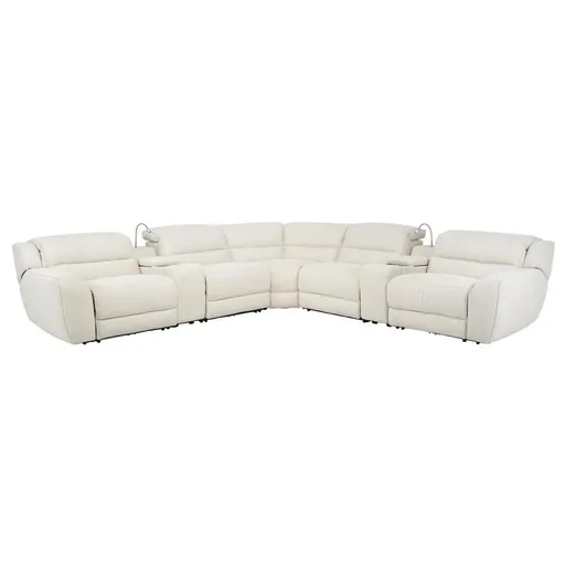 When it comes to the Cosmo II Power Reclining Sectional with 7PCS/3PWR, there really isn't a bad seat in the house. Made with microsuede fabric, this ultra-modern couch has all the high-tech upgrades you could want. Its two storage consoles each feature cupholders, a charging pad, USB ports and a reading light. Plus, it's super stylish with its welt trim, curved arms and gorgeous gray color.