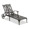 The Milan Collection offers a traditional mix of Artisan crafted ornamentation blended with detailed design elements that make it unique. This chaise lounge is enhanced with weather-resistant features such as a UV-resistant and hand-applied powder-coat finish. It has a sand and die-cast aluminum frame that is Artisan crafted with a combination of scroll and floral motifs on the back and seat. The back is fully adjustable for personal comfort and the wheels for easy mobility.