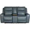 Mindanao Steel Leather Dual Power Recline Console Loveseat from Signature Motion from Ashley Furniture. Frame constructed of hardwoods and furniture grade engineered plywood. Covered in a top grain leather and leather match application in a steel gray color. Features power recline mechanism and power adjustable headrest for infinite comfort possibilities. Storage console includes two cup holders and hidden storage under lift top lid.