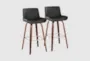 Enhance your home bar or kitchen island with the Santi 30" Midcentury Modern Fixed-height Barstool. This set of 2 barstools features a sleek grey faux leather upholstery and a stylish walnut wood finish, perfectly blending mid-century modern and contemporary design elements. The fixed bar height and 360-degree swivel functionality provide both comfort and convenience.
