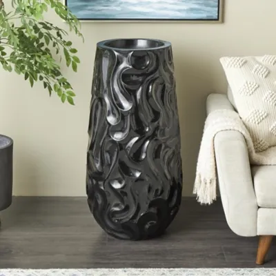 Perfect for displaying tall branches and greenery, or as a standalone piece, this black centerpiece vase enhances the ambiance of living rooms or bedrooms. Designed with felt or rubber stoppers at the base that prevent scratching furniture and table tops, as well as sliding around. This item ships in 1 carton. Suitable for indoor use only. This item ships fully assembled in one piece. This is a single black colored vase. Modern style. Vase has a 9 in mouth opening.
