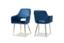 Enhance your dining experience with the Germaine Glam Fabric & Navy Blue Velvet Upholstered Gold Metal Dining Chair Set Of 2. These chairs combine mid-century modern style with luxurious comfort, making them a perfect addition to your dining room or kitchen. The navy blue velvet upholstery and gold metal legs create a striking visual appeal that will impress your guests.