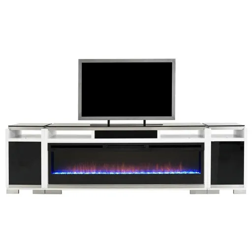 The Teire Electric Fireplace w/Cabinets has everything you need to enjoy cozy nights with your family. This white electric fireplace has multicolor LED lighting and a realistic flame effect that sets the ambiance, thermostat control to warm up your living room with an automatic timer function, and adjustable shelves behind the push-to-open doors to store any living room essentials. And if modern style is your favorite, this fireplace is perfect for your home because it’s made from engineered wood in a glossy white tone with brushed metal legs.