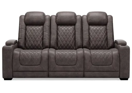 The Hyllmont power reclining sofa in trendy gray is proof of just how far recliners have come when it comes to form and function. Ultra cool and contemporary, this fully loaded power reclining sofa makes it so easy to social distance and make home your haven. Dressed to impress with diamond stitching inspired by sports car interiors, this reclining sofa is covered in a fabulous faux leather with pebbled effect for authenticity. High-tech advancements include a one-touch power control with Easy View™ adjustable headrest and USB plug-in and a drop-down table with cup holders, flip-up light and AC power/USB plug-ins.