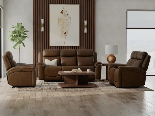 The Cork Sofa, Loveseat, and Recliner Set delivers a complete seating solution with premium comfort, space‑saving design, and modern features. Upholstered in rich brown top grain leather, each piece offers a luxurious feel and timeless style that complements a variety of interiors. Plush cushioning and generous proportions create a welcoming space for family gatherings or quiet nights in. Built with a zero‑wall design, all three pieces can be placed close to the wall while still fully reclining, making them ideal for maximizing your room layout.