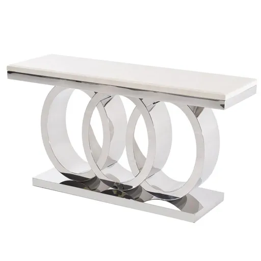 Allow the ultimate in luxury to welcome you home or anchor your living room's look with a combination of a stainless steel base and stone laminate. The Lillian Console Table makes an impact with a modern-inspired interlocking circular design crowned by a laminated stone faux crocodile pattern top.