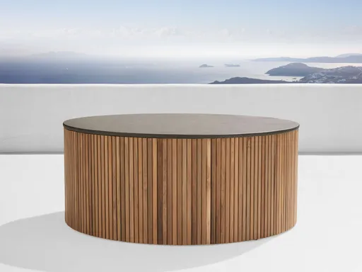 Boasting gorgeous vertical reeded detailing and contrasting charcoal-hued tops, our Pompeii Outdoor Collection will add a touch of organic warmth to your space. Rounded golden honey-toned bases are handcrafted from premium reclaimed natural teak that is untreated, unfinished, and finely sanded to achieve a smooth surface while preserving the wood’s natural graining and unique features.