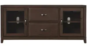 Divide and conquer with the Granthom 60" TV console, crafted of solid poplar with birch veneers. Wood-framed glass doors keep your media equipment visible yet protected, and cable cutouts allow you to snake cords through and ventilate your components. And the adjustable shelf means you can fit the interior space to meet your needs.