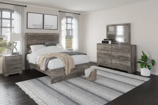 With its clean-lined look and modern attitude, this full panel bed is a fresh style awakening. Warm gray hue over replicated oak grain easily complements other furniture finishes. Simple, unadorned profile is given depth and dimension with the addition of plank style moulding on the headboard—proof that beauty lies in the details. Matching dresser, mirror and nightstand.