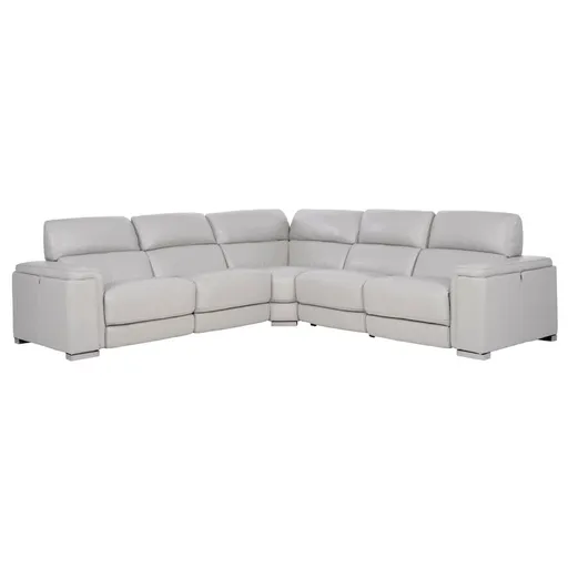 Let the Charlette Silver Leather Power Reclining Sectional do the talking for your living space. This modern sectional combines comfort, style and modern luxury with its power motion recliners, built-in USB ports, and power headrests. It's 100 percent leather and certain to "wow" every guest.