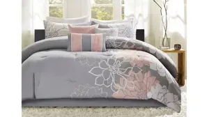 The Lola Comforter Set is the perfect update to bring beauty and grace to your bedroom. An over-scaled printed floral motif, in blush and white hues, adds a soft accent to the grey cotton sateen comforter. The solid grey reverse provides rich touch of color to complement the top of the bed. Coordinating shams with a floral motif pair beautifully with the comforter, while three decorative pillows with embroidered details and fabric manipulation complete the ensemble. For a clean finish, a solid grey bed skirt with a 15-inch drop is also included in the bedding set. Machine washable, this cotton sateen comforter refreshes your space with its casual elegance and charming allure.