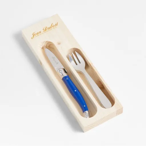 Laguiole of France crafts a party-ready set of oyster tools designed for seafood feasts. Reinterpreted in ocean blue, Laguiole's signature contoured knife handle joins a short blade specifically designed to pry open oyster shells. Six stainless steel oyster forks complete the set. An elegant housewarming or host gift, the tools nest in an open wood box.