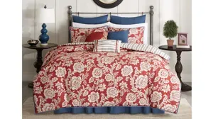 The Lucy Comforter Set is perfect for those seeking a traditional and comfortable atmosphere. The comforter features a timeless floral motif in a classic red, ivory, and blue color scheme. The comforter reverses to reveal a cozy red and blue striped pattern on an ivory ground. Three decorative pillows use embroidery and fabric manipulation to highlight the same elements seen on the comforter. Three decorative pillows, two shams, two shams, and one bedskirt are included with the comforter to complete this set.