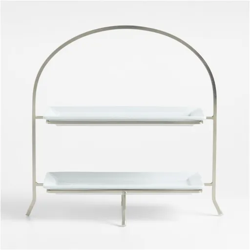Removable rectangular white porcelain plates nestle in the portable iron stand with a simple, stylish design. This two-tier server, a Crate and Barrel exclusive, saves space on a buffet table, elevating appetizers, pastries or fruit for an attractive, easily accessible display on a slim footprint.