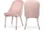 The Relle Pink Velvet Upholstered Dining Chair Set Of 2 brings a touch of modern elegance to your dining space. These chairs feature a soft pink velvet fabric that adds a luxurious feel, while the curved channel tufted back provides both style and comfort. The upholstered legs with gold tips enhance the contemporary design, making these chairs a perfect addition to any modern or mid-century modern decor.