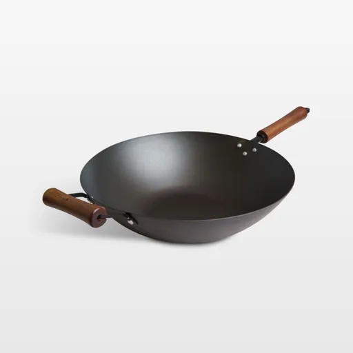 Designed for high-temperature cooking, this wok is ideal for searing meats and stir-frying vegetables. The flat-bottom design stays balanced on the stovetop and has a generous basin with 14-inch-diameter cooking surface and sloped sides for easy tossing and turning of ingredients. Made of carbon steel—a super-strong alloy of iron and carbon—the pan heats quickly and evenly. The beechwood handle and helper handle make it easy to maneuver the wok for cooking or serving. Like cast iron cookware, the pre-seasoned wok only gets better the more you cook with it.