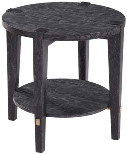 The Whitfield end table has a modern style. The legs and top feature an interlocking design, constructed with rubberwood solids and flat-cut, cerused oak. The table is finished in a black stain with generous white wax hang-up in the open grain. Brushed gold cross bars accent the base, piercing through the legs.