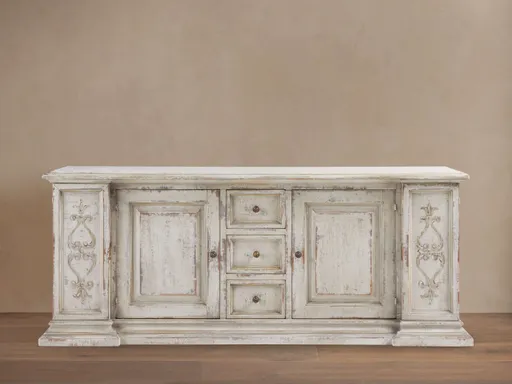 Italian craftsmanship and exquisite detail create the soul of our Arhaus-exclusive Bell’Arte collection. Our Vittoria Cabinet is no exception. Italian artisans treat each piece like a work of art. This truly one-of-a-kind cabinet is constructed from solid tulip wood and features hand-carved detailing in its cabinet doors, drawer fronts and molding. Each piece is painted and distressed by hand over three days. Multiple layers of paint and stain are artfully applied then gently removed to form a timeworn appearance. A final coat of lacquer protects and creates a subtle sheen. This classic cabinet features ample storage with fully adjustable shelving and secret compartments on either side.