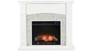 Freshen up your look with this ambience-inspiring Alcester media fireplace. A crisp white hue and linear composition define farmhouse inspired transitional chic, while lifelike faux stone surround the firebox, adding a rustic touch to the sleek, simple silhouette. Flickering LED flames and realistic embers add ambiance to your space, with or without heat. The flip-up media shelf comes complete with a cord control opening for easy storage of electronic accessories. Illuminate your senses with this electric fireplace media center in your living room, dining room, or open concept living space. <strong>Do not place TV on Mantel.</strong>