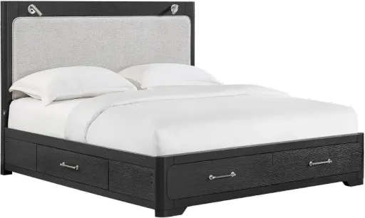 Bring a cool, effortless vibe to your bedroom with the Loft collection! Artfully combining style and comfort, this king-size storage bed features clean lines and curved edges finished in a vibrant black color that is artfully complemented with silver drawer pulls. Swivel light fixtures and an upholstered panel adorn the headboard, while convenient drawers along the sides and footboard provide handy storage. Includes headboard, storage footboard, rails, storage drawers, and supporting decking for a mattress.