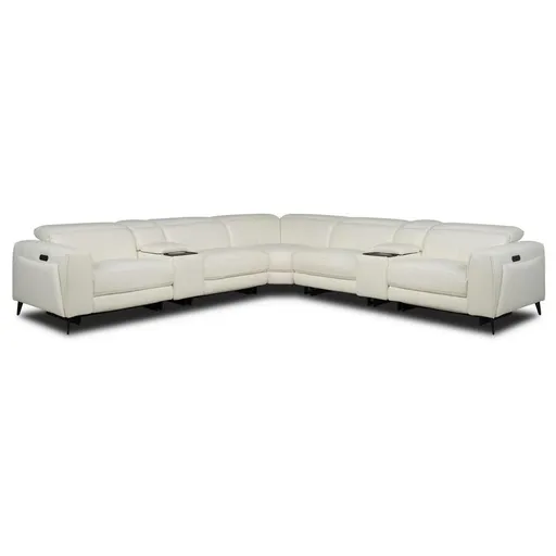 There's plenty of room for the whole family (and friends!) on the Luke 2.0 White Leather Power Reclining Sectional with 7PCS/3PWR. Made with 100 percent top grain leather where the body touches, this sofa checks all the right boxes where comfort is concerned, boasting deep, wide seating and power motion. But it doesn't skimp on style either, featuring sleek track arms, angled metal legs, welt trim and contrast stitching.