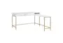 This Modern White + Gold 54" L-Shaped Storage Computer Writing Desk with Power Outlets is the perfect addition to any office or workspace. Designed to blend functionality and style, this desk provides ample storage and convenient power solutions. Its L-shaped design fits seamlessly into corners, making it ideal for small spaces.