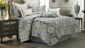 The beautiful updated vintage look of the Cambria 9-pc. Queen Comforter Set is effortless style at its best. This set is inspired by traditional aesthetics and woven into a beautiful combination of mist green and ivory, featuring a charming and eye-catching frame pattern. Ivory linen accent pieces with coordinating twist cord bring a sense of casual elegance to your bedroom, too. The accessories have removable covers, and the decorative pillows have waterfowl feather fill. Turn your bedroom into a restful retreat you will love for years. Included is 1 comforter, 2 standard shams, 2 euro shams and 4 decorative pillows that are feather filled.