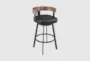 The Kathy 26" Swivel Counter Height Stool in Black Iron with Walnut Finish and Vintage Black Faux Leather combines modern design with mid-century charm. This stylish stool features a comfortable faux leather seat and a sturdy plywood frame, making it a perfect addition to any kitchen or dining area.