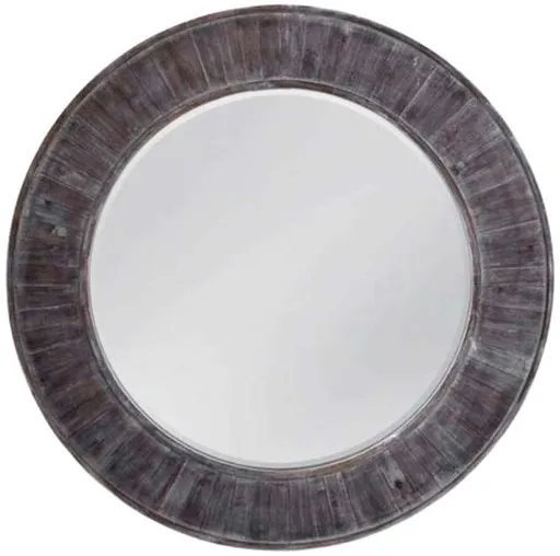 Hunter Wall Mirror is round framed in a rustic weathered grey finish with a planked design. Two "D" ring attachment points for ease of access wall mounting is included to hang mirror. The hand crafted details produced by a skilled artist lends itself to a unique technique.