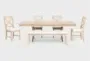 The Pollie Natural Farmhouse 72-90" Extendable Dining Table with Upholstered Bench and X Back Side Chair Set for 6 is a perfect addition to any dining space. Crafted in a natural wood color, this set combines farmhouse charm with traditional and classic elements. The solid rubberwood construction ensures durability, while the pine veneer over engineered wood adds a touch of sophistication.