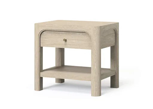 Graceful curves and purposeful details come together in this sculpted nightstand, a quiet companion for evening routines. A single drawer provides tucked-away storage, while an open shelf keeps essentials close at hand. Integrated USB-A and USB-C ports bring modern convenience to bedside living. Crafted from mahogany, engineered wood, and mango veneer, it blends softness, structure, and function in one elegant piece.