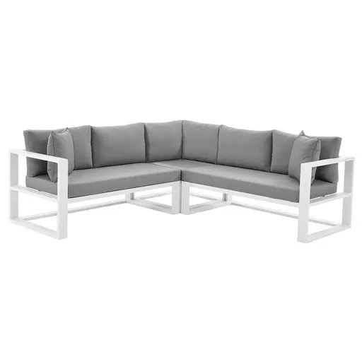 The two-tone design of the Mykonos Gray Sofa is an ideal addition to your outdoor furniture. This sofa is enhanced with gray polyester and acrylic blend cushions, white powder coated aluminum construction, and slat back style. The modular configuration allows you to create different combinations.