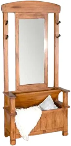 The Sunny Designs Sedona rustic oak hall tree provides practical storage and organization for entryways or mudrooms. It includes hooks for hanging coats, a bench for seating, and compartments for shoes or bags, helping keep everyday items neatly stored and accessible.