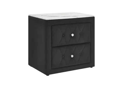 This elegant nightstand brings a touch of luxury to any bedroom with its rich, velvety texture and diamond-patterned tufting. The soft, plush exterior is complemented by gleaming crystal-like drawer knobs, adding a hint of glamour. With two spacious drawers, it offers ample storage for bedside essentials while maintaining a sleek and sophisticated look. The contrasting marble-style top provides the perfect surface for a lamp, book, or decor item, seamlessly blending style and function. Ideal for those seeking a statement piece, this nightstand elevates any bedroom with modern opulence.