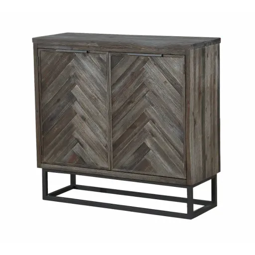 Add handsome style and practical storage to your home with this 2-door accent cabinet! It features a washed gray finish with chevron-patterned doors and a slim metal base, while its rectangular shape and clean lines enhance its versatile, contemporary look. Suitable for storing various items, it offers a blend of transitional styling and practical storage.
