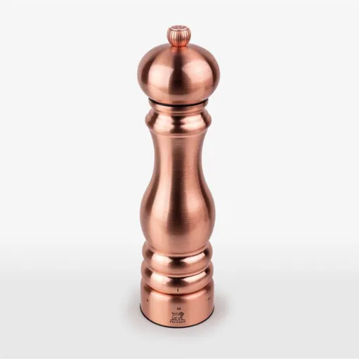 Designed more than 30 years ago, this classically turned salt mill continues to grace professional and home kitchens. The Unique line updates Peugeot's iconic Paris in stainless steel with a warm copper finish. Topped with a matching knob marked with Peugeot's lion's head logo, the mill fits well in hand, dispensing perfectly ground salt. The carbon steel grinding mechanism offers six defined settings.