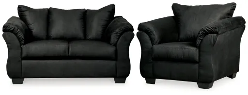 Talk about fine lines and great curves. That’s the beauty of this standout loveseat and chair set—made to suit your appreciation for clean, contemporary style. A striking flared frame, comfy pillow top armrests and an ultra-soft upholstery that holds up to everyday living complete this fashion statement.