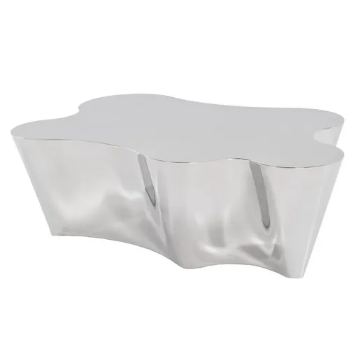 The Movement Coffee Table offers a truly unique visual statement for a living room. This minimalist modern piece is made of 100% polished stainless steel with a stunning free-form shape and reflective surface.