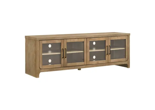 A celebration of craftsmanship and function, this expansive TV stand brings quiet charm to any living room or entertainment space. Framed in warm light oak with glass-front cabinet doors, it offers a balanced blend of display and storage. Crafted from solid Asian hardwood, engineered wood, and oak veneer, this console houses media components with ease, thanks to spacious shelving and built-in cord access that keeps everything neat and ready for viewing.
