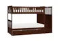 The Kory Brown Cherry Wood Twin Over Twin Bunk Bed is a perfect addition to any kids' bedroom. This traditional style bunk bed features a dark cherry finish and is made from solid pine wood. It includes a reversible stairway chest and underbed storage boxes, drawers, and a trundle for added functionality.