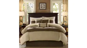 For comfort and a chic design, the Palmer bedding collection is the perfect fit. Its ivory comforter is made from pieced microsuede for a soft feel while the piecing details add texture and color with their taupe and brown colorways. The decorative pillows add a mix of nature-inspired leaves and solid neutrals to combine perfectly with this collection.