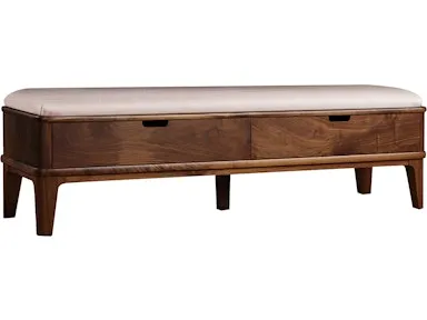 The Walnut Grove Bench offers a tightly upholstered seat atop beautifully tapered legs and two spacious, functional drawers. Its mid-century modern design is flexible enough for any room setting, and the seat is available in married fabric or Salvador Dove leather.