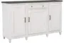 The Caralee White Brown Wood Farmhouse Two Tone Sideboard Buffet offers a blend of functionality and rustic charm perfect for your dining room or kitchen. Constructed from select Asian hardwood with oak and birch veneers, this large rectangular sideboard provides ample storage space with three doors and one drawer. The timeless farmhouse style and grey wood finish easily complement any decor.