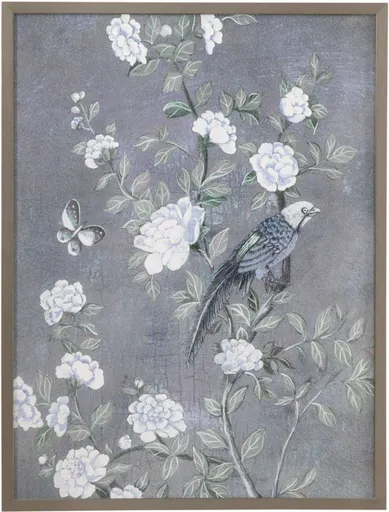 Birds and Bloom I is a print framed in a 1" pewter shadow box molding and features a special textured finish giving the effect of an original canvas artwork.
